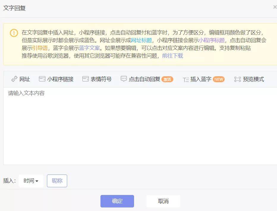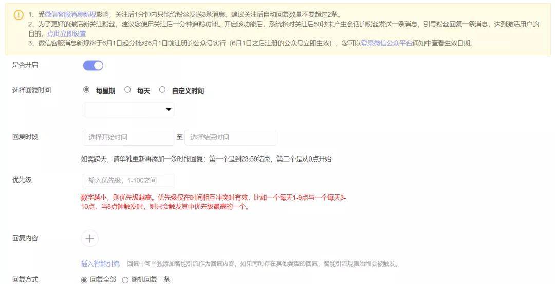 設置時可加入粉絲昵稱、小程序鏈接、點擊自動回復等。