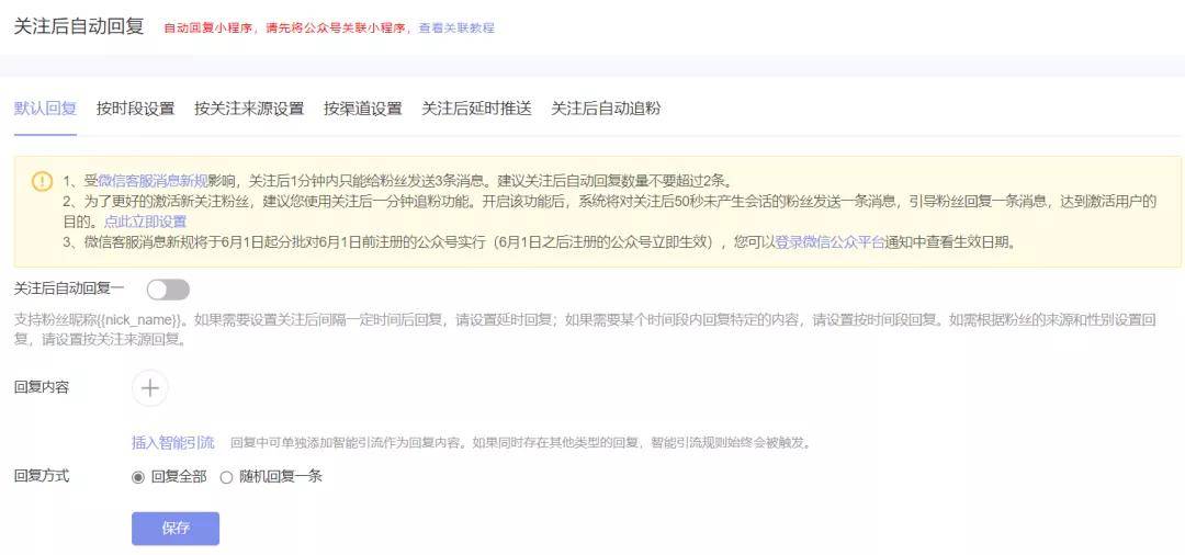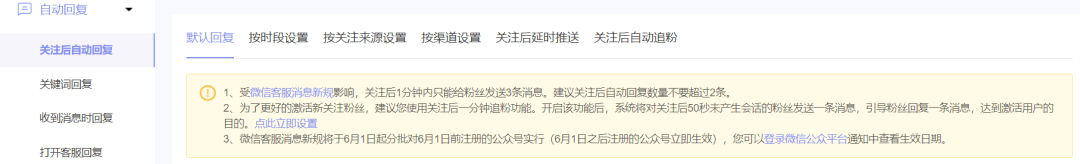目前被關注回復有6種模式:默認回復、按時段設置、按關注來源設置、按渠道設置、關注后演示推送、關注后自動追粉。